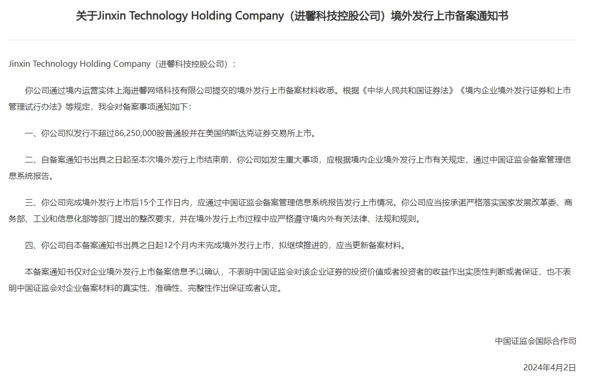 智通财经APP获悉,4月2日,中国证监会发布关于Jinxin Technology Holding