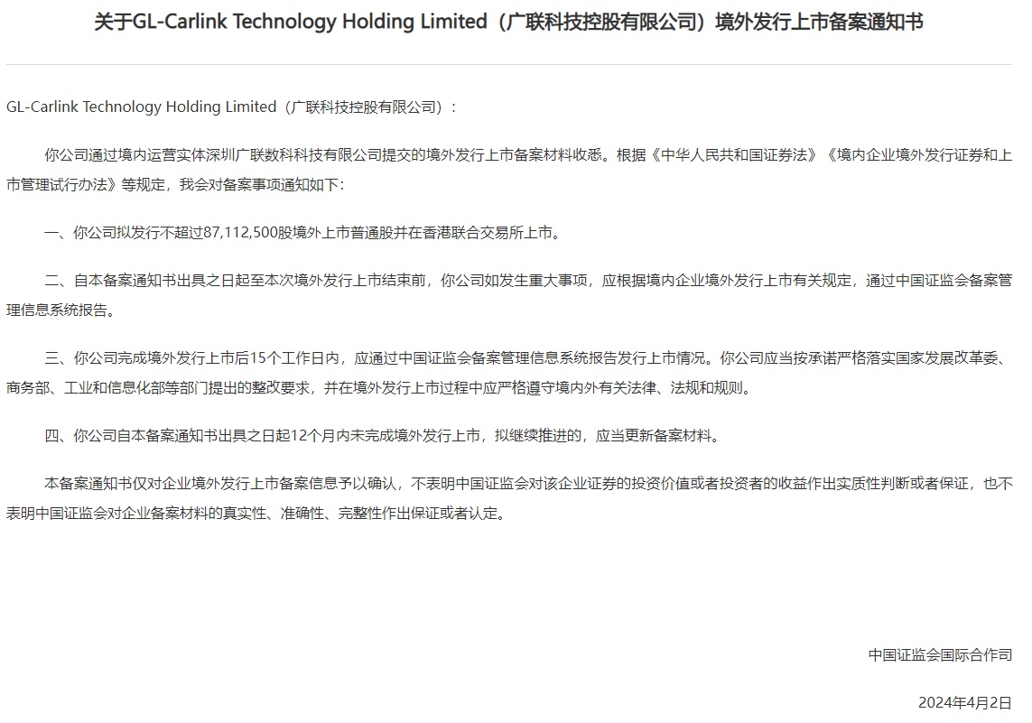 智通财经APP获悉,4月2日,中国证监会发布《关于GL-Carlink Technology Holding