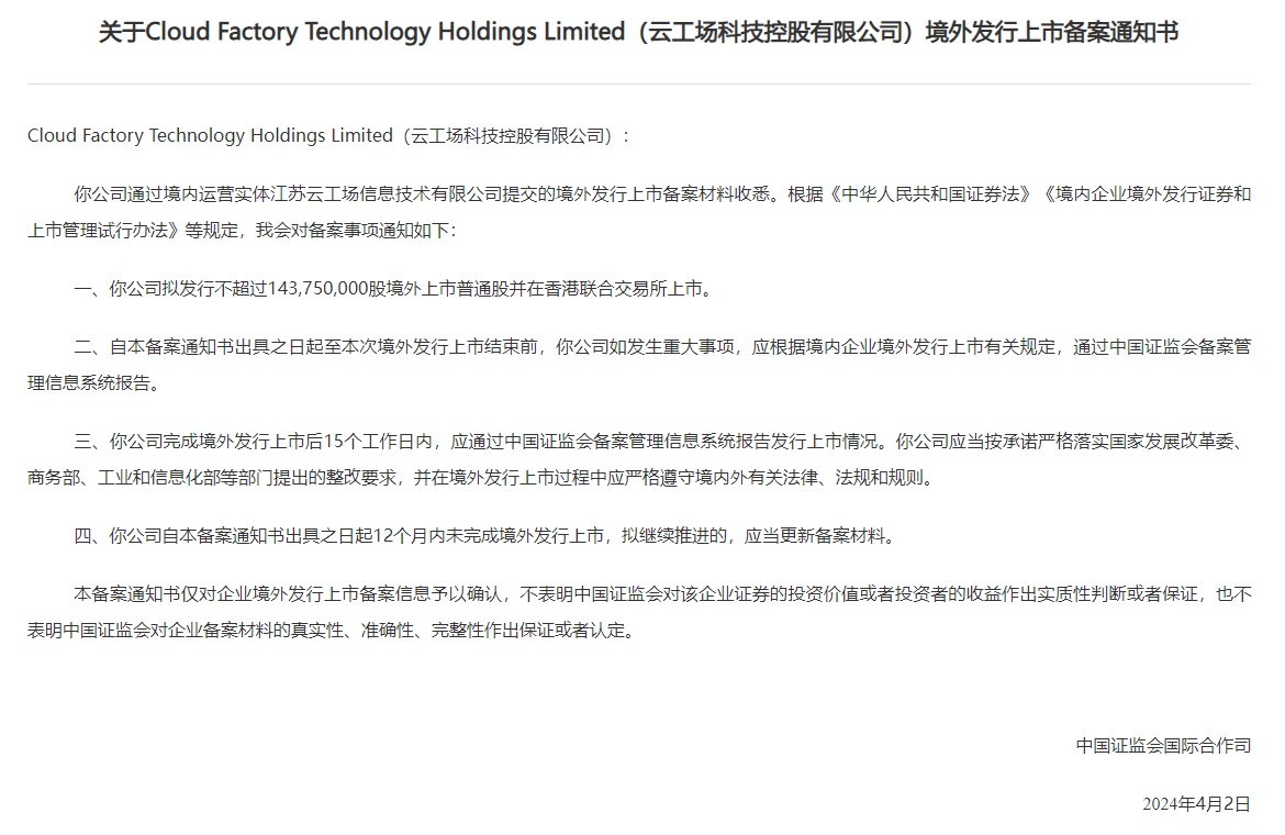 智通财经APP获悉,4月2日,中国证监会发布关于Cloud Factory Technology Holdings