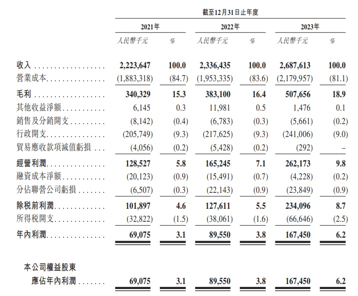 财务方面,于2021年度、2022年度、2023年度,公司实现营业收入分别约为人民币22.24亿元、23.36亿元、26.88亿元。同期,公司年内利润分别约为人民币6907.5万元、8955万元、1.67亿元。