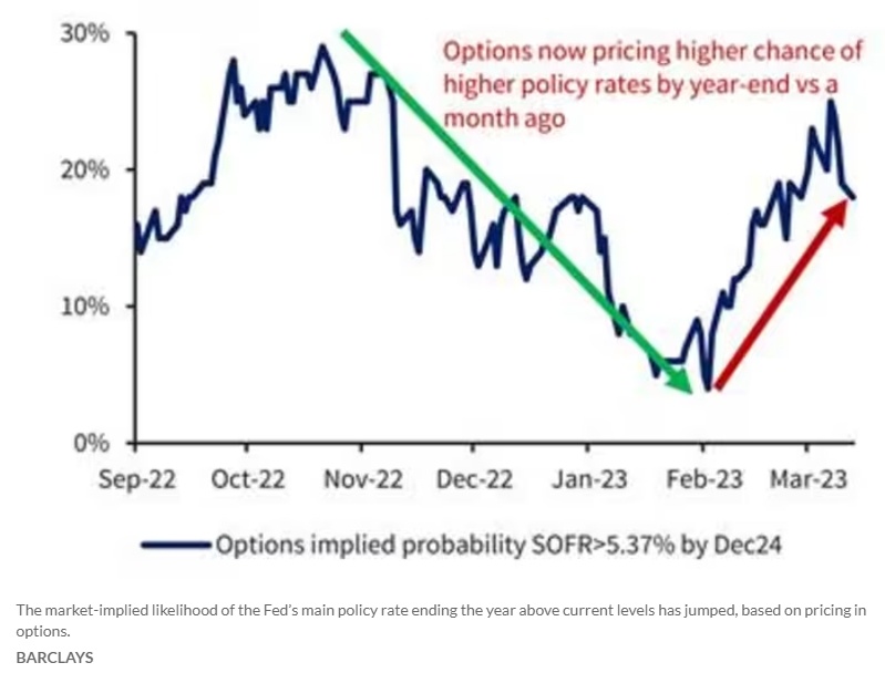 智通财经APP获悉,周三,巴克莱银行的策略团队在一份报告中指出,目前的利率市场已经为可能少于美联储预计的三次每次25基点的降息做好了准备。同时,期权市场预计到年底短期借款成本将高于当前的5.25%至5.5%之间,这一概率远高于2月初和3月初的预期。