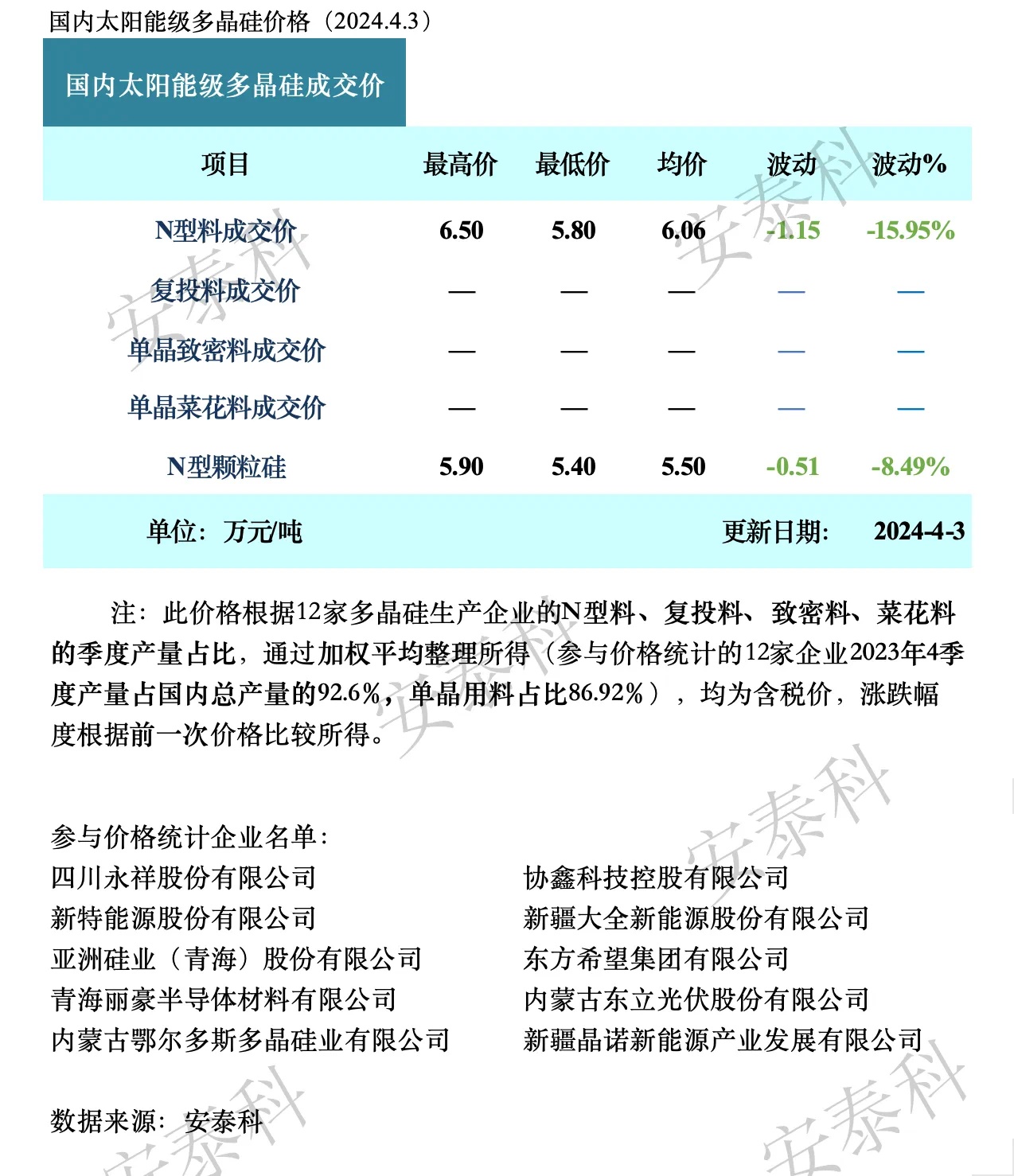 据了解,目前下游企业硅料库存基本消耗完毕,签单意愿有所恢复,但在硅片价格快速下跌的背景下,硅片企业希望采购更具性价比的硅料,部分企业开始积极购入低价混包料。同时,前期高价硅料订单尚存在改价及暂停发货风险。尽管目前硅片企业已出现实际的减产行为,但去库力度并不显著。总体来看,下游原料采购积极性不强,仅少量试探性成交。