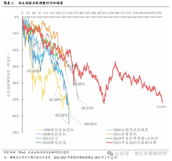 港股自2021年以来的调整已经持续了超过700天,回调幅度最深达到51.87%,回调时间超过了1998年以来的历次调整,回调幅度超过了2000年互联网泡沫破灭,接近1998年亚洲金融危机和2018年金融危机时期。