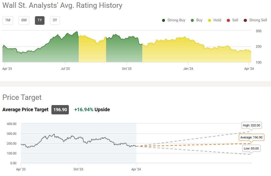 当前,华尔街分析师们对特斯拉的整体看法正在迅速恶化,主要因为在高利率压力之下电动汽车销量增速放缓的迹象日益显著,并且全球各政府的激励措施日渐枯竭。华尔街分析师对特斯拉未来12个月股价的平均预期为196.90美元,但最低为85美元,最高为320美元,两者相差巨大。华尔街分析师普遍评级则长期处于“持有”,而不是“买入”评级。自今年年初以来,特斯拉股价下跌了约32%,目前徘徊在168美元附近。
