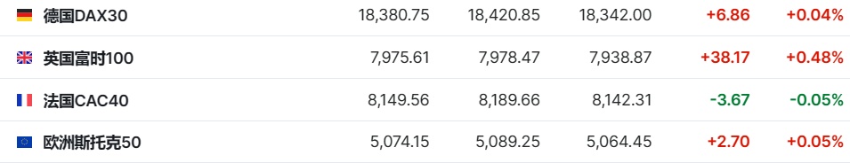 2.截至发稿,德国DAX指数涨0.04%,英国富时100指数涨0.48%,法国CAC40指数跌0.05%,欧洲斯托克50指数涨0.05%。