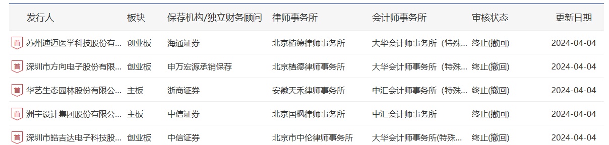 智通财经APP获悉,4月4日,据深交所官网显示,皓吉达、洲宇设计、华艺生态、方向电子、速迈医学等5家公司IPO审核状态变更为“终止(撤回)”,均为发行人、保荐人主动撤回申请。这5单保荐项目中,中信证券占2家,海通证券、申万宏源承销保荐、浙商证券各占1家。