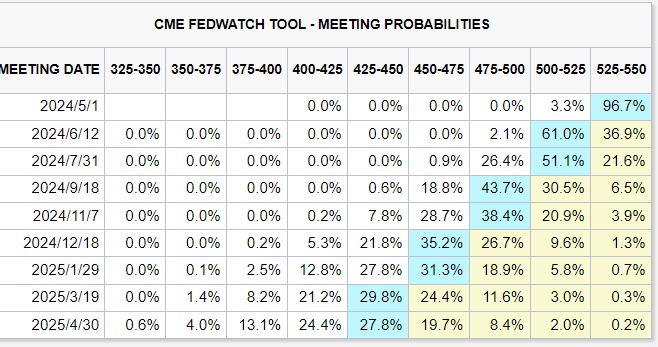 但近日公布的企业裁员人数正在小幅上升,以及初请失业金人数上升数据出炉后,降息75个基点以及6月美联储首次降息的预期均大幅升温。初请失业金数公布后,CME“美联储观察工具”显示,6月首次降息的概率高达61%,高于本周多数时间维持的50%左右,利率期货交易员们普遍押注美联储今年将降息75个基点。