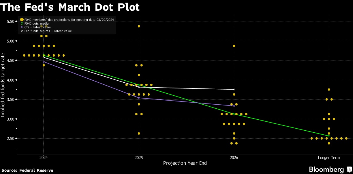 本周公布的PMI数据显示,美国制造业PMI时隔16个月重返荣枯线,暗示美国经济扩张之势。在强劲的制造业PMI数据公布后,美联储6月份首次降息的可能性一度大幅降低至50%以下,反映在利率掉期合约中的美联储今年降息幅度市场预期收窄至不到65个基点——这一数据甚至低于美联储3月FOMC利率点阵图中值所显示的2024年降息75个基点。