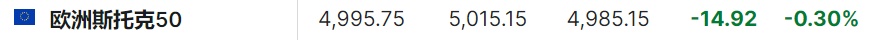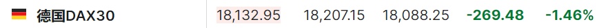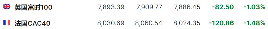 2.截至发稿,德国DAX指数跌1.46%,英国富时100指数跌1.03%,法国CAC40指数跌1.48%,欧洲斯托克50指数跌0.30%。