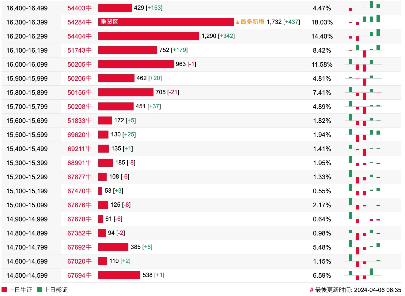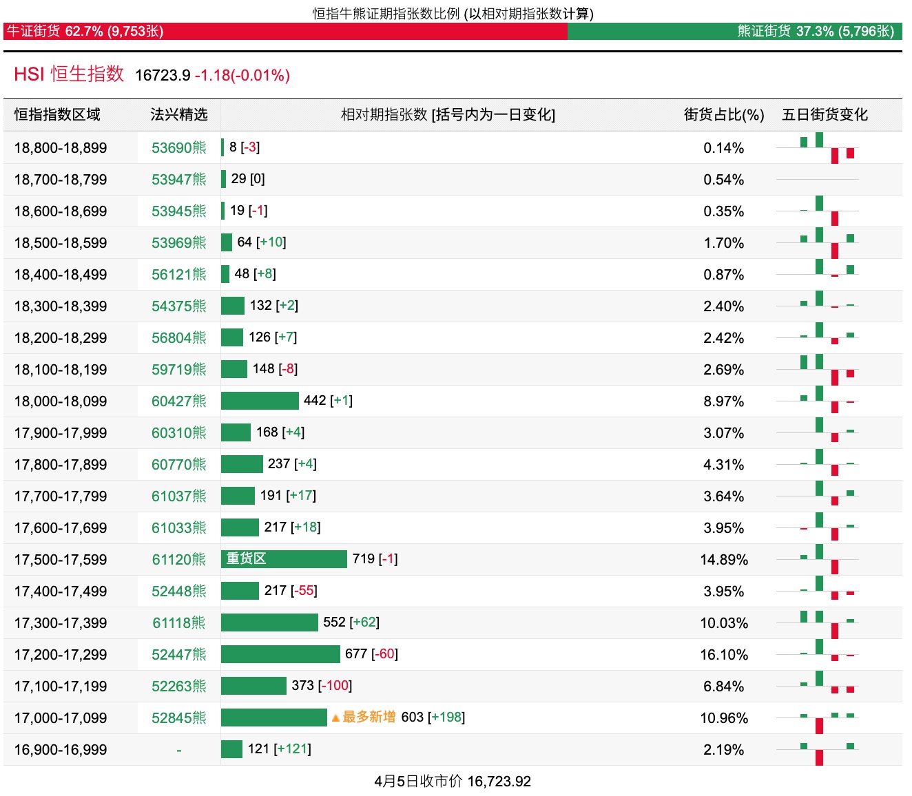 牛证街货重货区与最多新增均在16300-16399区间,该区间最新熊证数量为1732张,较上一交易日增加437张。