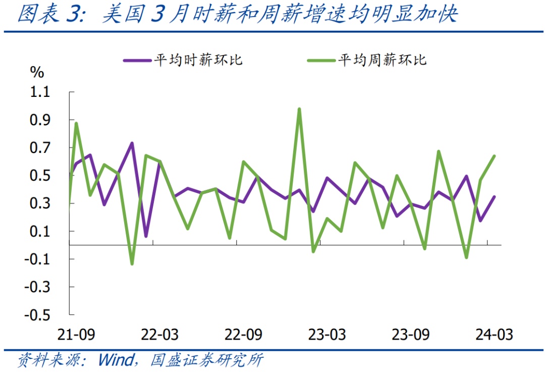 总体就业表现:美国3月新增非农就业30.3万,高于预期值20万,是2023年2月以来最高;2月新增非农就业从27.5万下修至27万,1月新增就业从22.9万上修至25.6万,前两月合计上修2.2万。失业率3.8%,低于预期值和前值3.9%。劳动参与率62.7%,高于预期值和前值62.5%,是2020年3月以来第二高。平均时薪环比0.3%,符合预期,高于前值0.2%。平均每周工时34.4小时,高于预期值和前值34.3小时。得益于时薪增速和工作时间双双改善,平均周薪环比由上月的0.47%提升至0.64%,大幅高于过去12个月的均值0.34%。