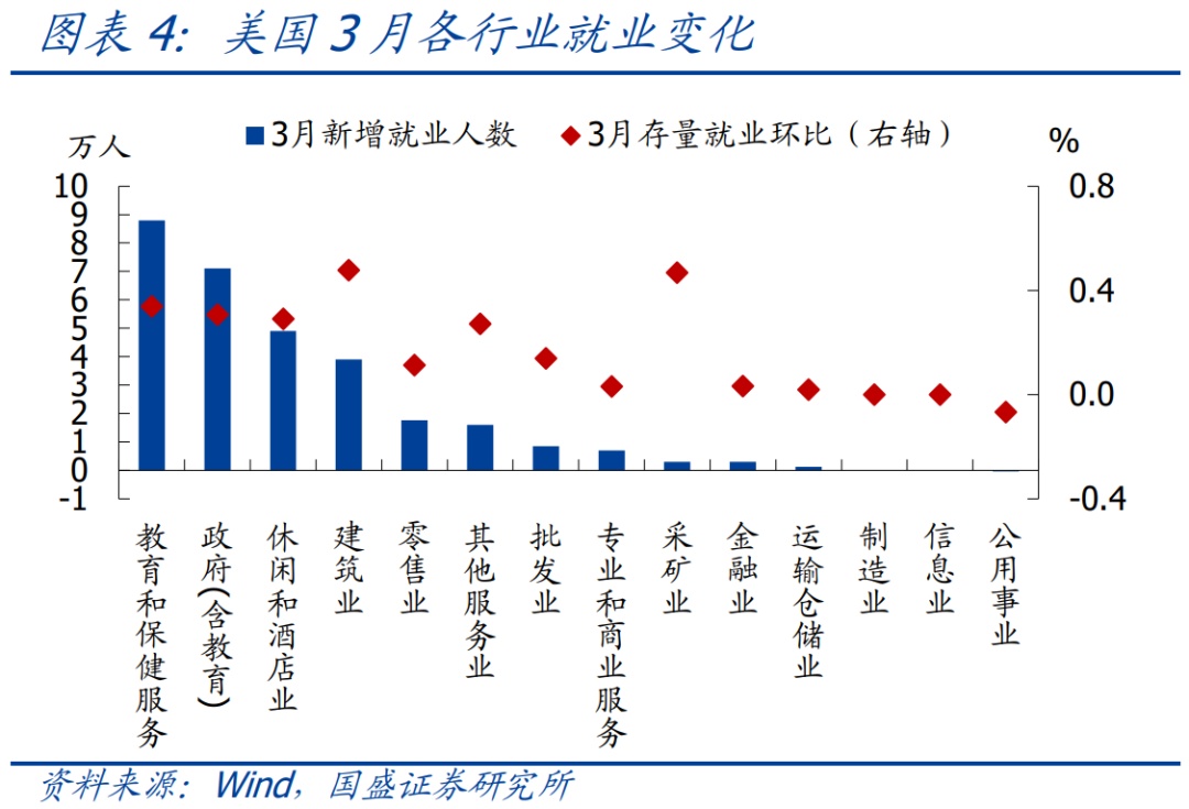 行业就业表现:3月美国整体非农就业环比提升0.2%,就业环比改善幅度较大的行业包括:建筑业0.5%、采矿业0.5%、教育和保健服务0.3%、政府部门0.3%、休闲和酒店业0.3%,其他服务业0.3%;表现较差的行业包括:公用事业、信息业、制造业、运输仓储业、专业和商业服务业、金融业,均呈现0增长或小幅负增长。