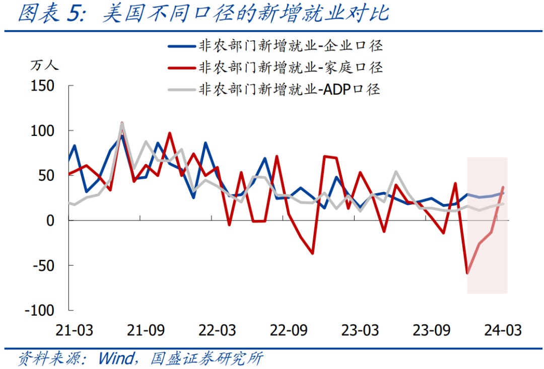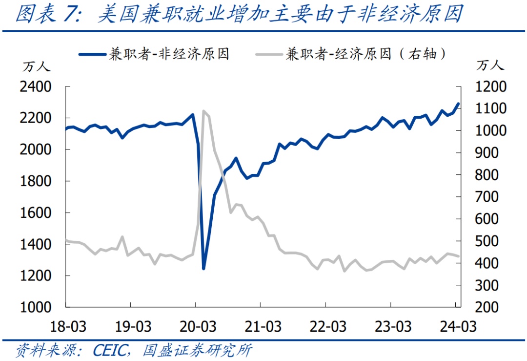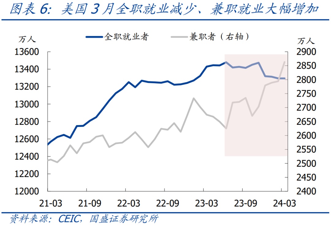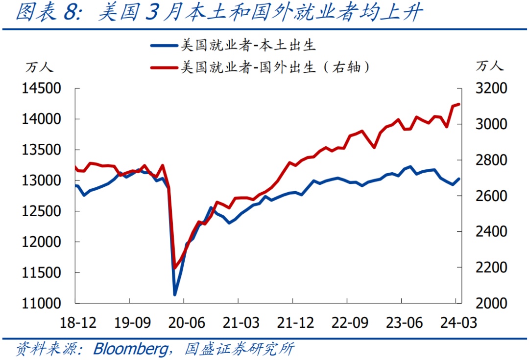 不同口径数据:3月家庭口径调查的就业人数增加36.9万人,是过去4个月首次正增长。全职就业者减少0.6万人,兼职就业者增加69.1万人(身兼多职会重复统计),反映出新增就业完全由兼职工作所贡献;新增兼职就业者中,因非经济原因从事兼职增加了59.3万人,因经济原因从事兼职下降了6.8万人,反映出兼职大幅增加更多是由于就业倾向的转变,而非经济环境恶化。本土出生的就业者增加92.9万,是过去4个月以来首次增加,过去12个月的均值为-7.3万;国外出生的就业者增加11.2万,与过去12个月的均值12.4万大体相当。前期报告中我们曾多次提示,当前非法移民已成为美国新增就业的主力军,本月数据表明,非法移民对就业的贡献仍大,与此同时美国本土劳动者的就业状况也明显改善,这反映出招聘需求十分强劲。