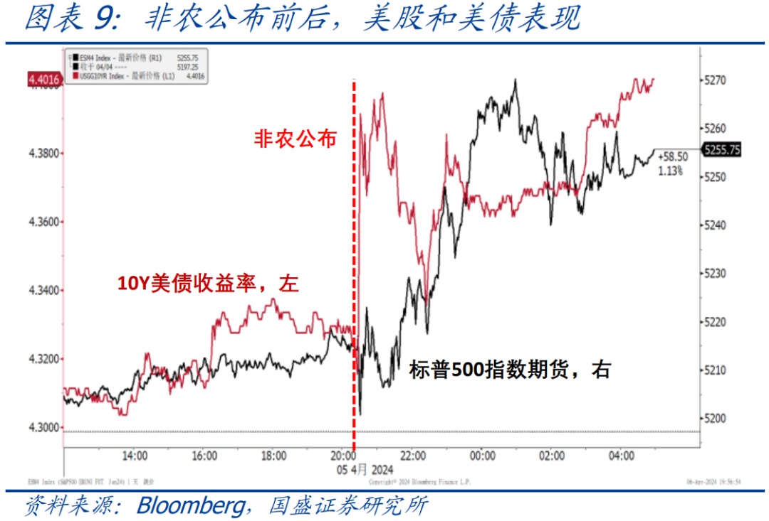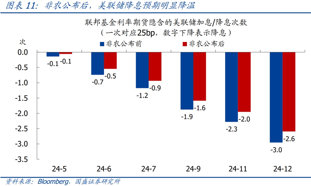 2、非农数据公布后,美股、美债利率、美元、黄金均上涨,降息预期明显降温。