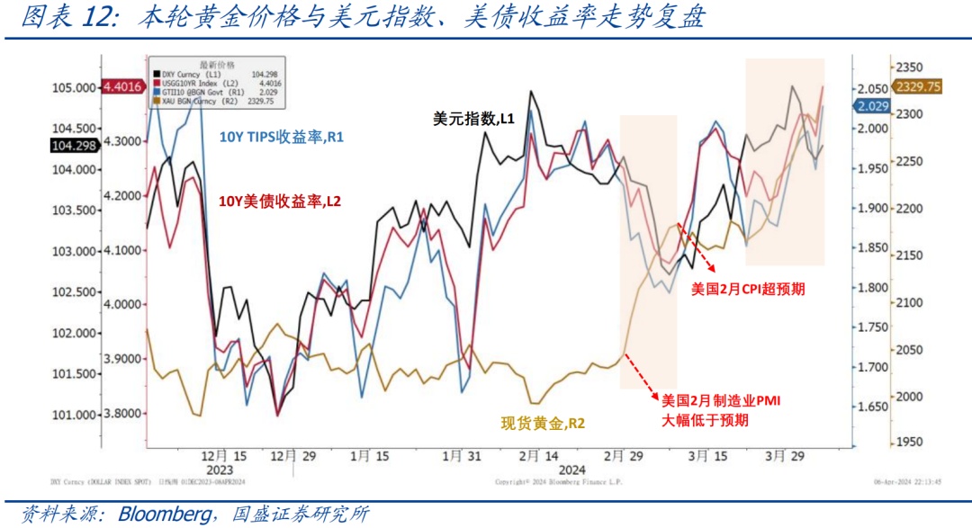 本轮黄金快速上涨始于3月1日,迄今现货黄金已从不到2050美元/盎司涨至最高2330美元/盎司,涨幅达14%。传统分析框架认为,黄金价格主要受美元指数、实际利率(美债或TIPS收益率)、降息预期、避险情绪的影响。按照这一框架对本轮黄金上涨进行复盘,我们发现黄金上涨的初期仍符合传统基本面框架,之后开始逐渐脱离基本面,具体表现如下: