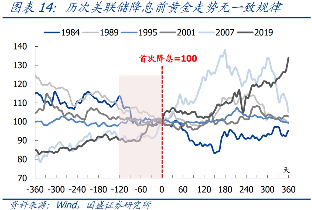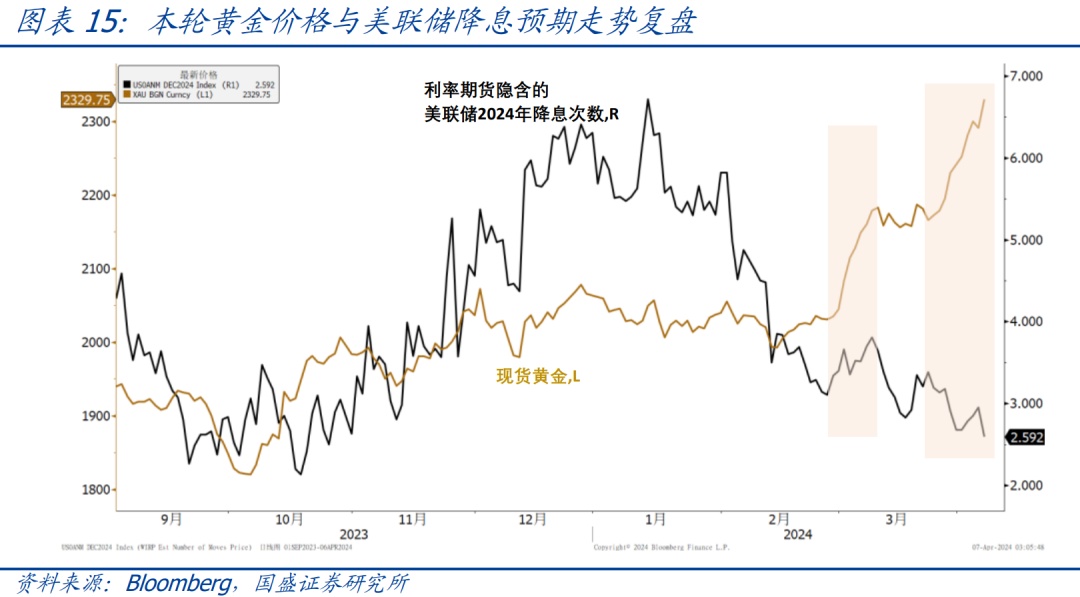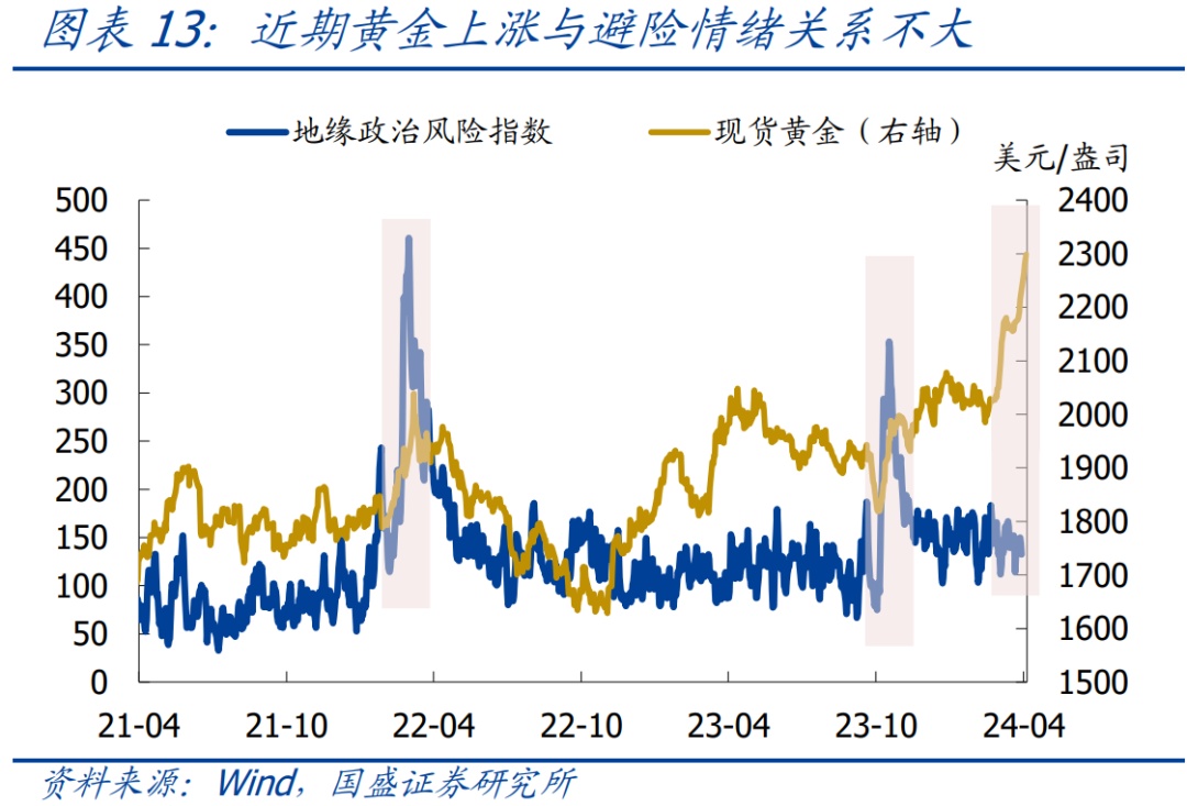 降息预期:3月初以来,美联储降息预期先是因PMI低于预期而出现升温,之后随着通胀、就业等数据超预期而持续降温。从走势看,本轮黄金上涨的初期受到了降息预期升温的驱动,但是3月下旬之后的上涨则与降息预期相背离。事实上,历史经验显示,美联储首次降息前2-4个月,黄金价格走势无明显规律。