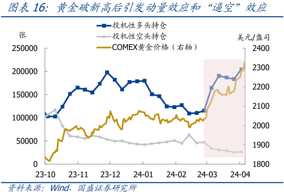 3、黄金价格为何脱离基本面?破新高后的动量效应和“逼空”可能是主因。3月初黄金价格创历史新高后,投机性多头头寸快速增加、空头头寸快速减少,可能是触发了动量策略大量买入;并且在这一过程中大量空头止损离场,“逼空”效应也扩大了黄金的涨幅。历史上看,黄金每次破历史新高之后,短期内通常延续快速上涨,也与本轮的表现相一致。