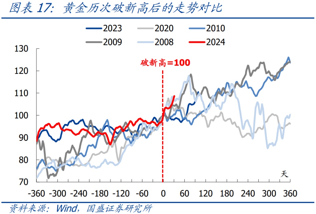 我们倾向于认为,传统分析框架并未失效,黄金短期脱离基本面可能是受交易性因素影响。根据前文分析,本轮黄金上涨的起点是由于3月1日公布的美国2月PMI低于预期,导致美元和美债收益率下行、美联储降息预期升温,因此在上涨之初具备基本面支撑。3月4日,黄金收盘价创历史新高,也正是从那以后,黄金投机性多头头寸快速增加、空头头寸快速减少,背后可能反映了破新高之后上方阻力消失,从而触发了一些动量策略大量买入,推动了黄金继续上涨;并且在这一过程中大量空头止损离场,“逼空”效应也扩大了黄金的涨幅。历史上看,黄金每次破历史新高之后,短期内通常延续快速上涨,也与本轮的表现相一致。