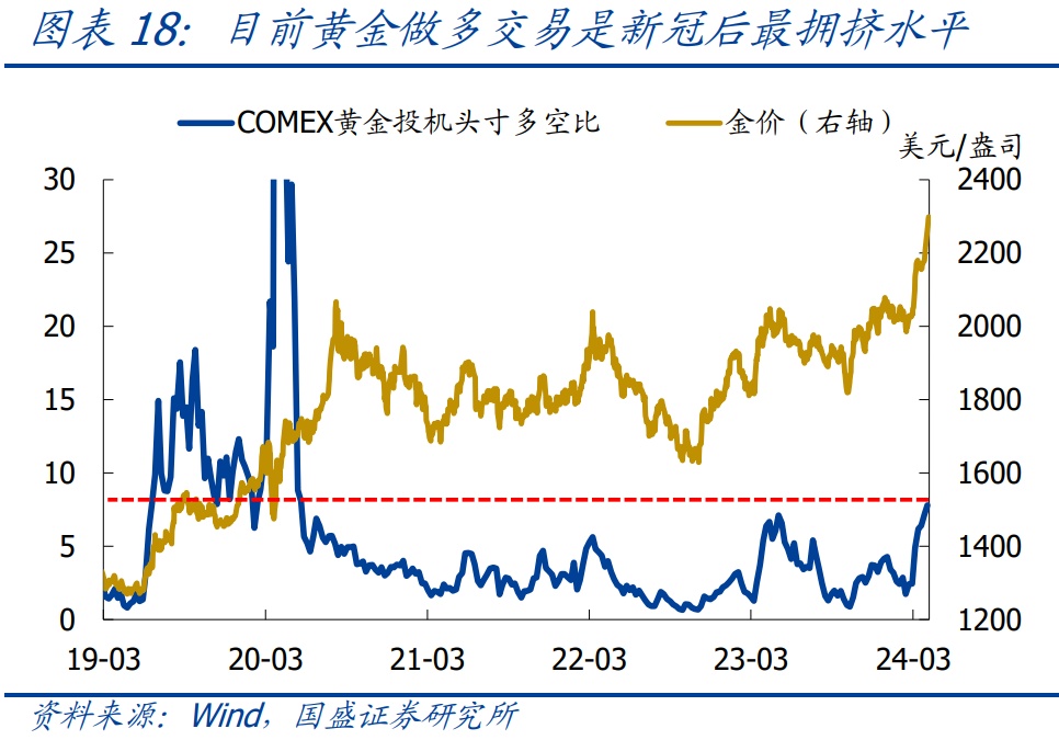 短期有回调风险:历史上看,黄金在破新高后均会经历一段明显调整,快则从破新高的几天后开始,慢则从破新高的2个月后开始。本轮黄金破新高至今已满一月,按照历史规律推演,黄金最多再涨1个月左右就会经历调整。此外从期货和期权持仓情况来看,目前黄金多空比已达新冠后的最高值,高于俄乌冲突、巴以冲突、硅谷银行危机时期的水平,这也反映出做多黄金交易已经较为拥挤。后续若空头停止入场、多头逐步止盈,可能出现“多杀多”式的下跌。