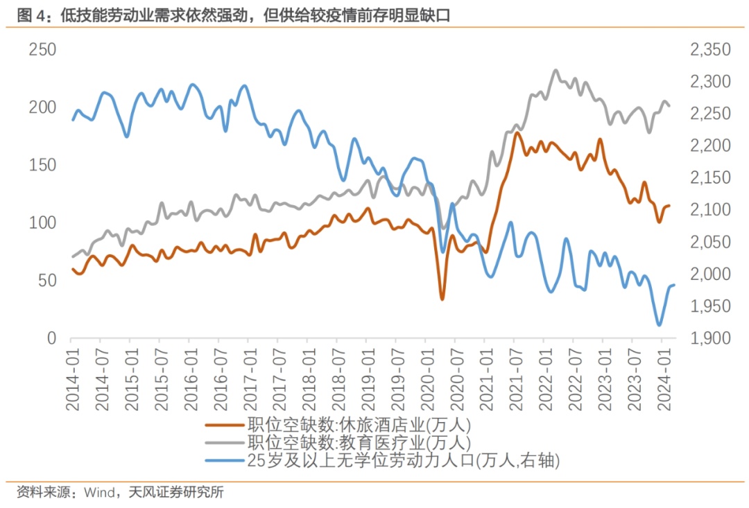 失业率小幅下行0.1%至3.8%,持续处于历史相对低位;劳动参与率小幅升高0.2%至62.7%。低技能劳动力供给虽有所修复,但较疫情前仍有明显差距;尤其医疗保健等“核心”行业的供需缺口明显。