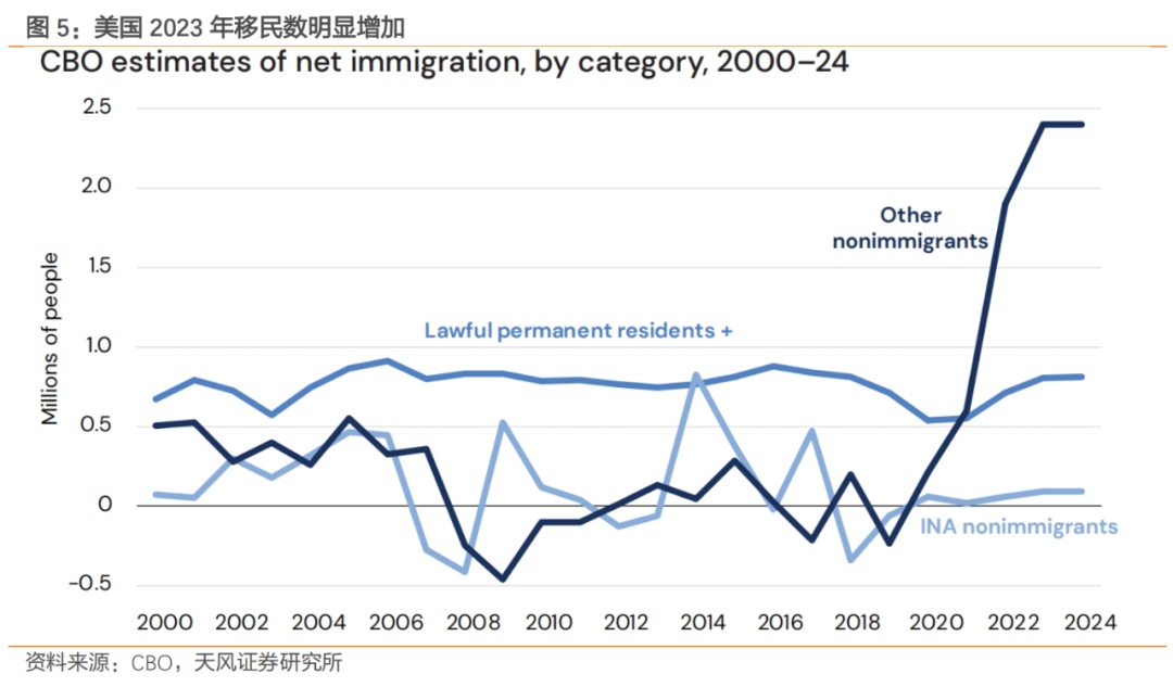 诚然,此前CBO报告显示2023年美国总移民约330万人(其中约240万人为“无身份移民”),较2022年的260万人,以及疫情前均值90万人大幅上行。但这240万人中有超过50%的入境美国发生在2023年8月之后,即使用历史上最快的审批速度,每个月释放的劳动力新增数也不会超过30万人。