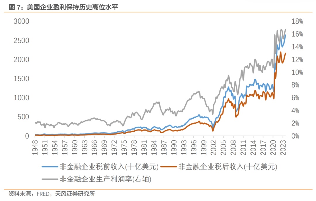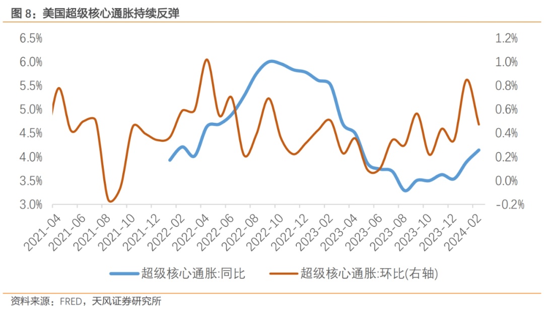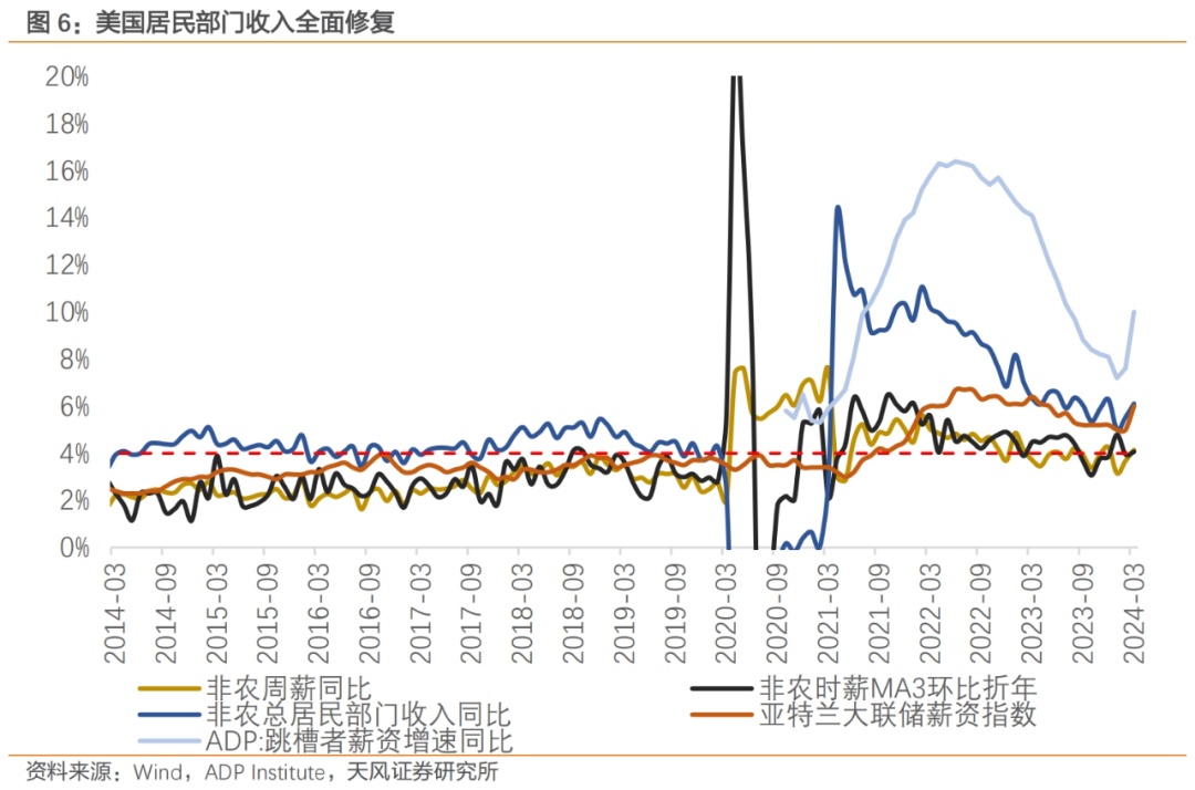 企业盈利与居民收入的良性循环仍在延续。在居民薪资收入全面增长,叠加劳动力供给修复缓慢的背景下,美国当前核心通胀/超级核心通胀的反弹趋势或仍将延续;强劲的劳动力需求以及各口径下均保持在4%以上的薪资增速强化了居民的消费预期。