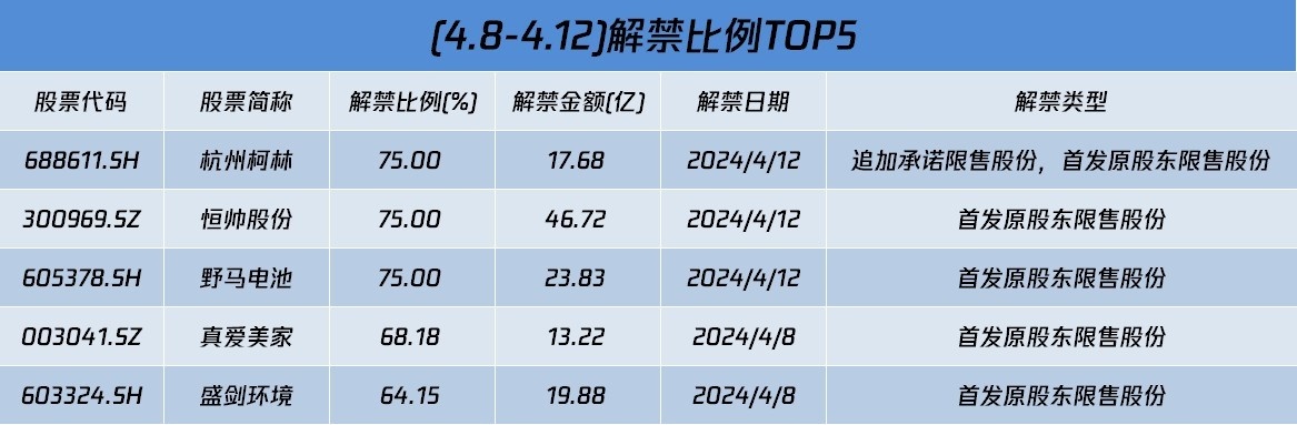 从解禁比例来看,本周杭州柯林、恒帅股份、野马电池等三股实际解禁比例达75%。