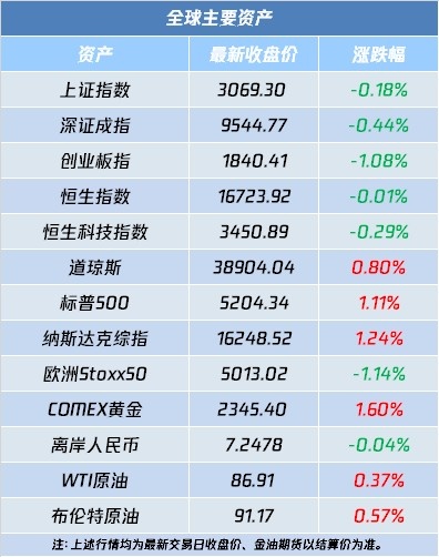 自选哥提示,上周五美股三大指数集体收涨,纳指涨超1%;中概指数跌0.18%,离岸人民币小幅升值;COMEX 6月黄金期货收涨1.6%,报2345.4美元/盎司;WTI 5月原油期货收涨0.37%,报86.91美元/桶。