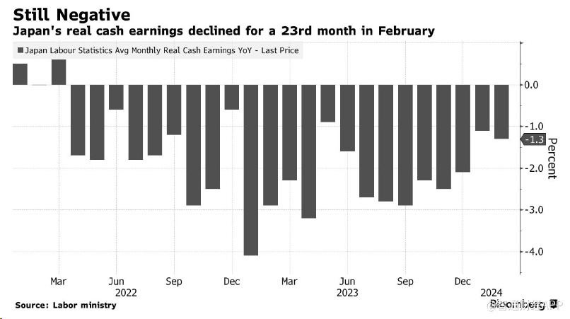 智通财经APP获悉,日本2月份工人实际工资连续第23个月下降,此前消费者价格指数(CPI)增长加速,拖累了支出,这一结果可能会让日本央行暂时按兵不动。