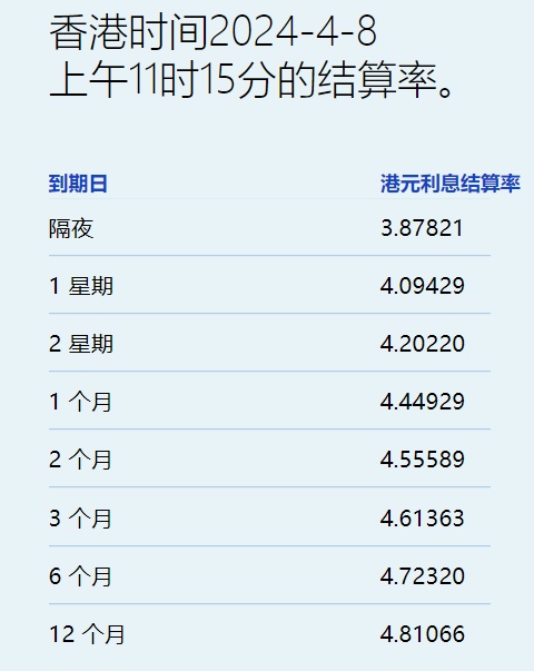 智通财经APP获悉,4月8日,港元拆息持续偏软,隔夜息跌至3.87821%,创逾三周新低,与楼按相关的一个月连跌6日,低见4.44929%,续创2023年9月11日最低。反映银行资金成本的三个月拆息亦降至4.61363%,见七个月新低。不过一周及两周拆息反弹,分别升至4.09429%和4.2022%。长息方面,6个月拆息跌至4.7232%;一年期报4.81066%。