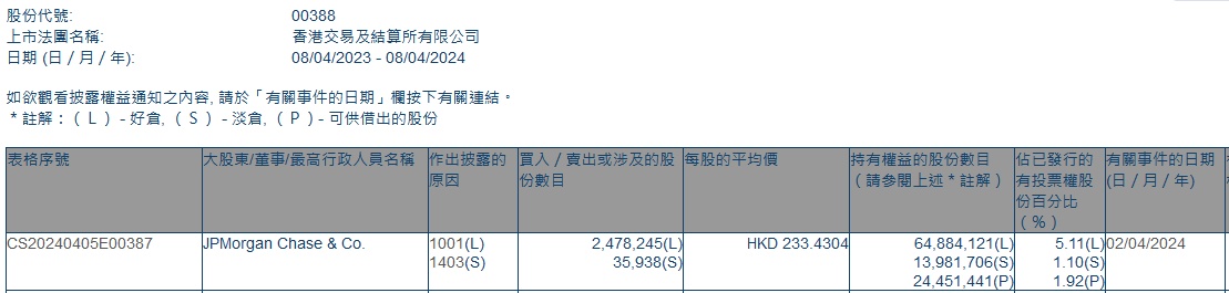 智通财经APP获悉,香港联交所最新资料显示,4月2日,小摩增持香港交易所(00388)247.8245万股,每股作价233.4304港元,总金额约为5.78亿港元。增持后最新持股数目约为6488.41万股,最新持股比例为5.11%。