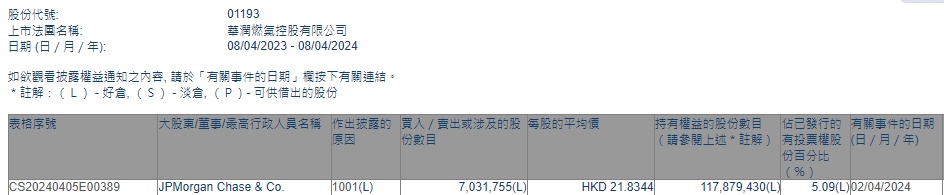 智通财经APP获悉,香港联交所最新资料显示,4月2日,摩根大通增持华润燃气(01193)703.1755万股,每股作价21.8344港元,总金额约为1.54亿港元。增持后最新持股数目约1.18亿股,最新持股比例为5.09%。
