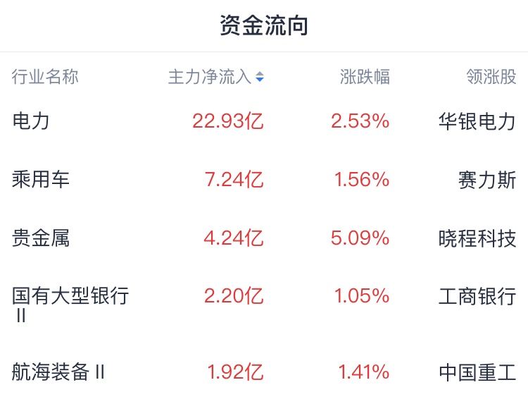 主力资金方面,资金青睐电力、乘用车、贵金属等行业,其中净流入电力板块超20亿元;资金出逃白酒、工业金属、光伏设备等行业。