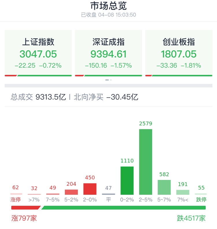 4月8日,A股放量大跌,主力资金继续抱团周期股,贵金属、有色等方向领涨,电力、汽车、银行等板块涨幅居前;白酒、医药板块大跌,AI赛道继续走低,染料、光伏等板块跌幅居前。