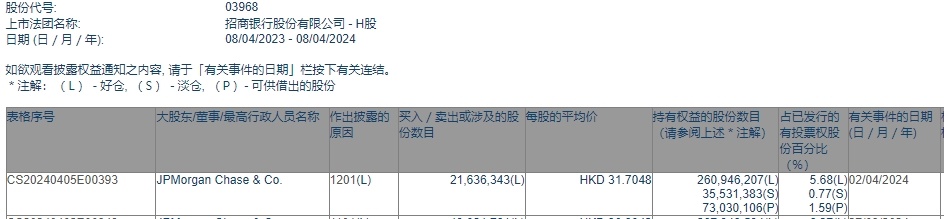 智通财经APP获悉,香港联交所最新资料显示,4月2日,小摩减持招商银行(03968)2163.6343万股,每股作价31.7048港元,总金额约为6.86亿港元。减持后最新持股数目约为2.61亿股,最新持股比例为5.68%。