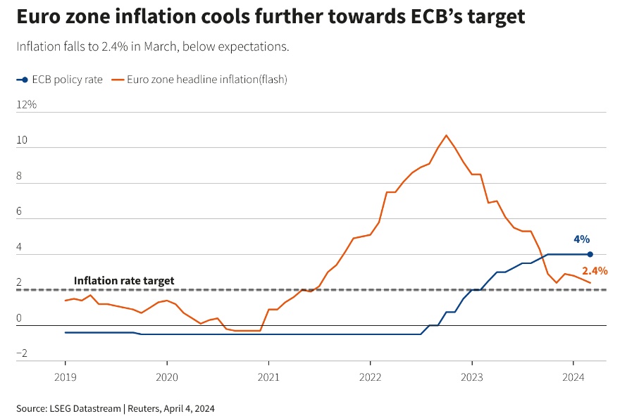 今年3月,欧元区通胀放缓至更接近欧洲央行2%的目标,这为欧洲央行引领美联储和其他主要央行开启宽松周期铺平了道路。
