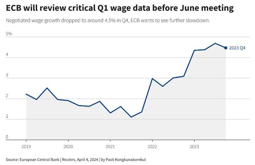 根据薪资谈判达成的协议,欧元区工资增长从上一季度创纪录的4.69%降至第四季度的4.47%后,政策制定者希望看到进一步放缓的迹象。