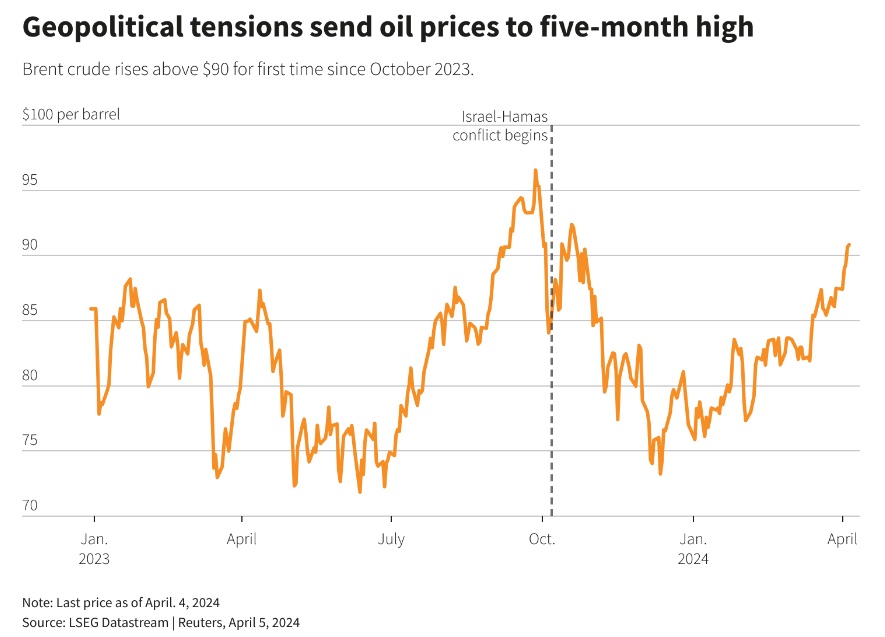 地缘政治紧张局势和对需求上升的预期已将布伦特原油价格推至每桶90美元以上的五个月高点。