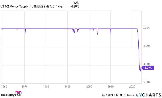 2022年3月,美国M2货币供应量约为21.71万亿美元。根据美国联邦储备系统理事会(Board of Governors of Federal Reserve System)最新发布的月度数据,2024年2月M2达到20.78万亿美元。正如在上面的图表中看到的,这代表了相对较小的0.5%的同比降幅,但自2022年3月以来,下降了4.29%,这也是自大萧条以来M2首次有显著的下降。