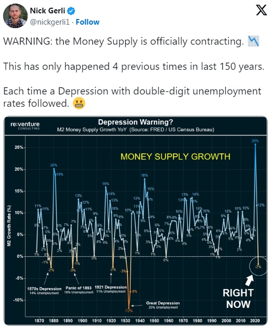 去年,Reventure Consulting首席执行官Nick Gerli在X平台上分享了下面这篇文章。Gerli利用美国人口普查局和美联储的数据跟踪了1870年以来M2的变动。Gerli指出,在M2货币供应量同比至少下降了2%的5个例子中,其中包括2023年出现的同比大幅下降。在此之前,1878年、1893年、1921年和1931-1933年,M2至少下降2%的情况都与美国经济的萧条和高失业率时期有关。
