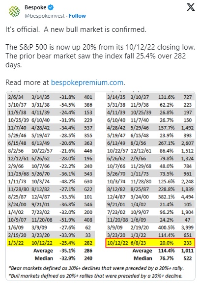 此外,根据Bespoke的测算,标普500指数历史上最长的熊市只有630个日历日(1973年1月11日至1974年10月3日)。相比之下,27次标普500指数牛市中有13次比最长的熊市更长。