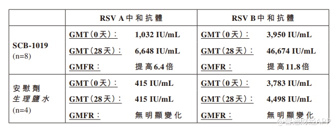 在I期临床试验中,首批年轻成年人群组(18-59岁)分别接种SCB-1019或生理盐水安慰剂,第0天(接种前)和第28天(接种后)中和抗体的几何平均滴度(GMTs)和几何倍数升高(GMFRs)的初步结果如下:
