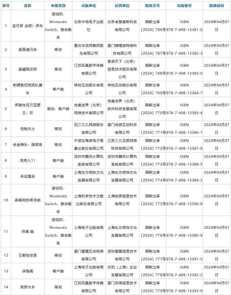 智通财经APP获悉,4月8日,国家新闻出版署发布4月进口网络游戏审批信息,共14款游戏获批,其中包括腾讯(00700)旗下《洛克人11》、完美世界(002624.SZ)旗下《乖离性百万亚瑟王:环》等。