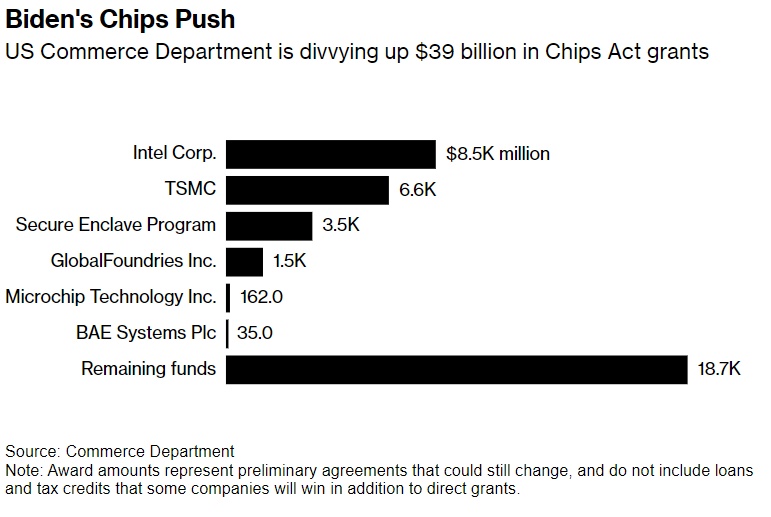 英特尔已经签署了一项近200亿美元补助和贷款的初步协议,而来自韩国的芯片制造商三星电子(Samsung Electronics)预计将获得超过60亿美元的补助。美国商务部还向制造老一代芯片的公司给予部分补助支持,同时预计将在未来几周内宣布向美国存储巨头美光科技(MU.US)提供数十亿美元的一揽子在美工厂建造计划。