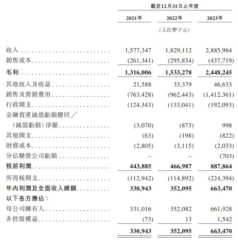 财务方面,于2021年度、2022年度及2023年度,毛戈平实现收入分别约为15.77亿元、18.29亿元及28.86亿元人民币;年内利润分别约为3.31亿元、3.52亿元及6.63亿元人民币。