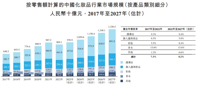 中国是全球第二大化妆品市场,2022年零售额占全球化妆品行业市场份额的11.8%。根据弗若斯特沙利文的资料,2017年至2021年,由于消费支出增加,中国化妆品行业呈现快速增长,而2022年疫情对化妆品行业的影响部分抵销了这一增长。按零售额计算,中国化妆品行业的市场规模由2017年的6,402亿元增长至2022年的9,091亿元,复合年增长率为7.3%。在全球主要经济体中,中国化妆品行业的增长速度最快。根据弗若斯特沙利文的资料,按零售额计算,中国化妆品行业的市场规模预计将在2027年达到人民币13,505亿元,与2022年相比,复合年增长率为8.2%。