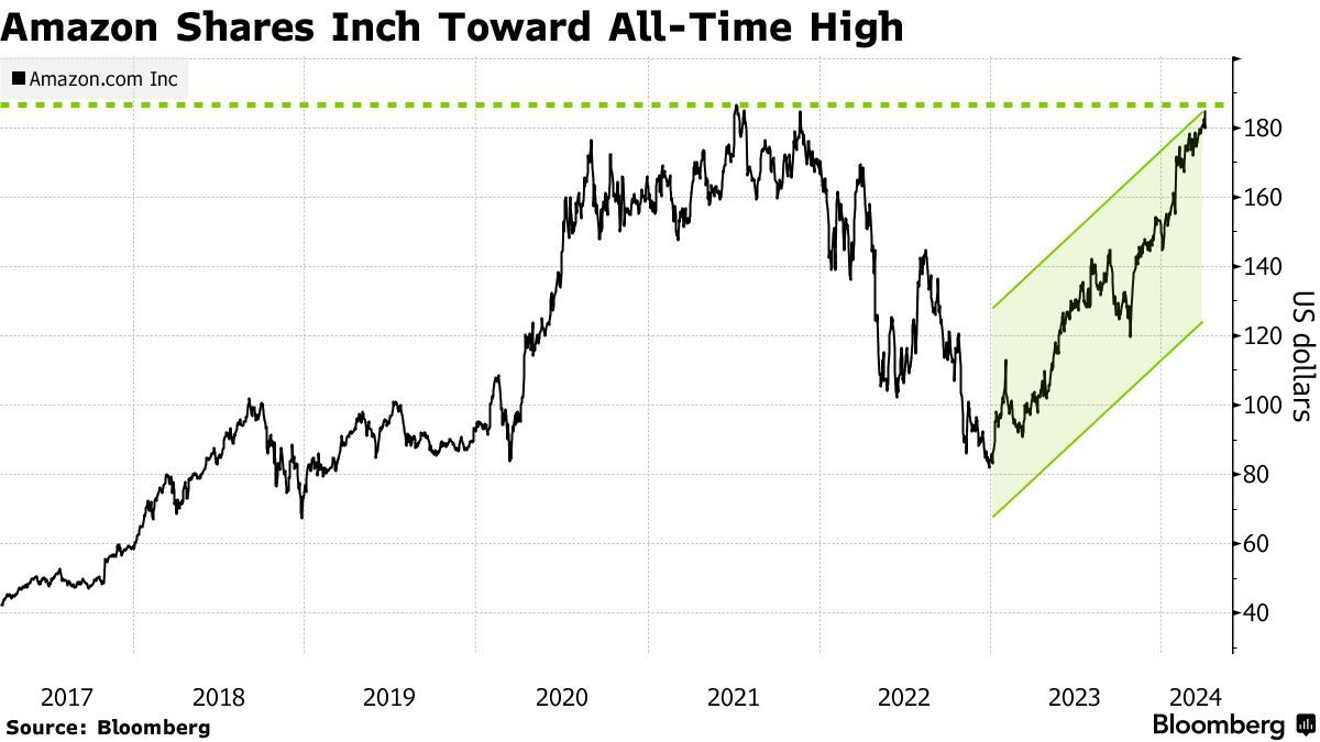 智通财经APP获悉,华尔街投资者终于开始做分析师们一直建议的事情——买入亚马逊(AMZN.US)。周一,这家电子商务和云计算巨头收涨0.1%,报185.19美元。数据显示,周一盘中,该股一度上涨1.2%,至187.29美元,超过了2021年7月创下的186.57美元的收盘高点,之后涨幅有所收窄。Meta(META.US)、微软(MSFT.US)和英伟达(NVDA.US)等大型科技股近几个月都突破了历史新高,而亚马逊在从疫情后约57%的下跌中恢复过来时落后于其他公司。亚马逊周一股价一度触及历史新高意味着,该股是最后一只股价触及历史新高的大型科技股。