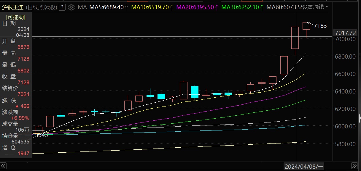 智通财经APP获悉,在黄金价格不断攀升之际,同为“贵金属家族”的白银近期也不甘示弱。4月8日,白银期货价格开启狂飙模式,截至收盘,多个白银期货合约价格涨停,其中白银主力连续合约报价达到7128元/kg,创下历史新高。