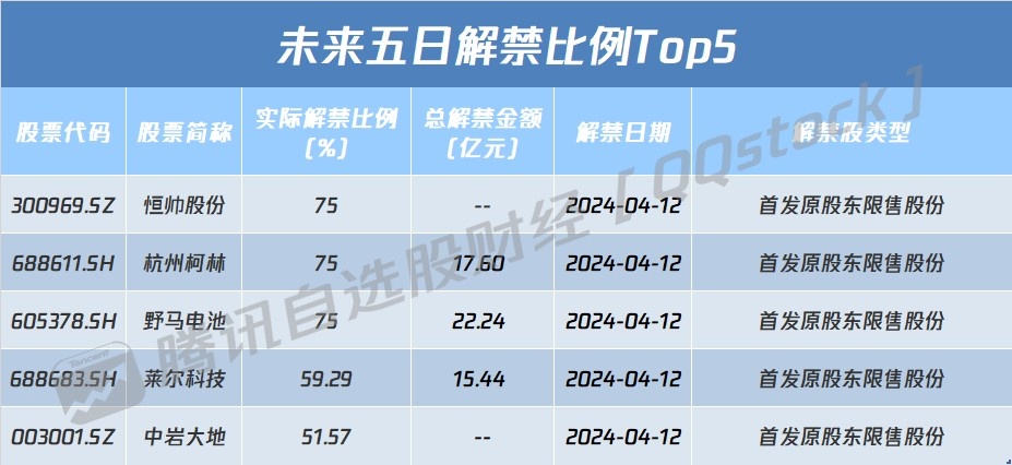 从解禁比例来看,未来五日恒帅股份实际解禁比例达75%,其次解禁比例居前的分别为杭州柯林和野马电池。