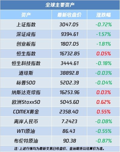 自选哥提示,隔夜美股三大指数几乎平收,道指跌0.03%;人民币资产集体上扬,中概指数涨0.06%,离岸人民币小幅升值;COMEX 6月黄金期货收涨0.55%,报2358.4美元/盎司;WTI 5月原油期货收跌0.55%,报86.43美元/桶。